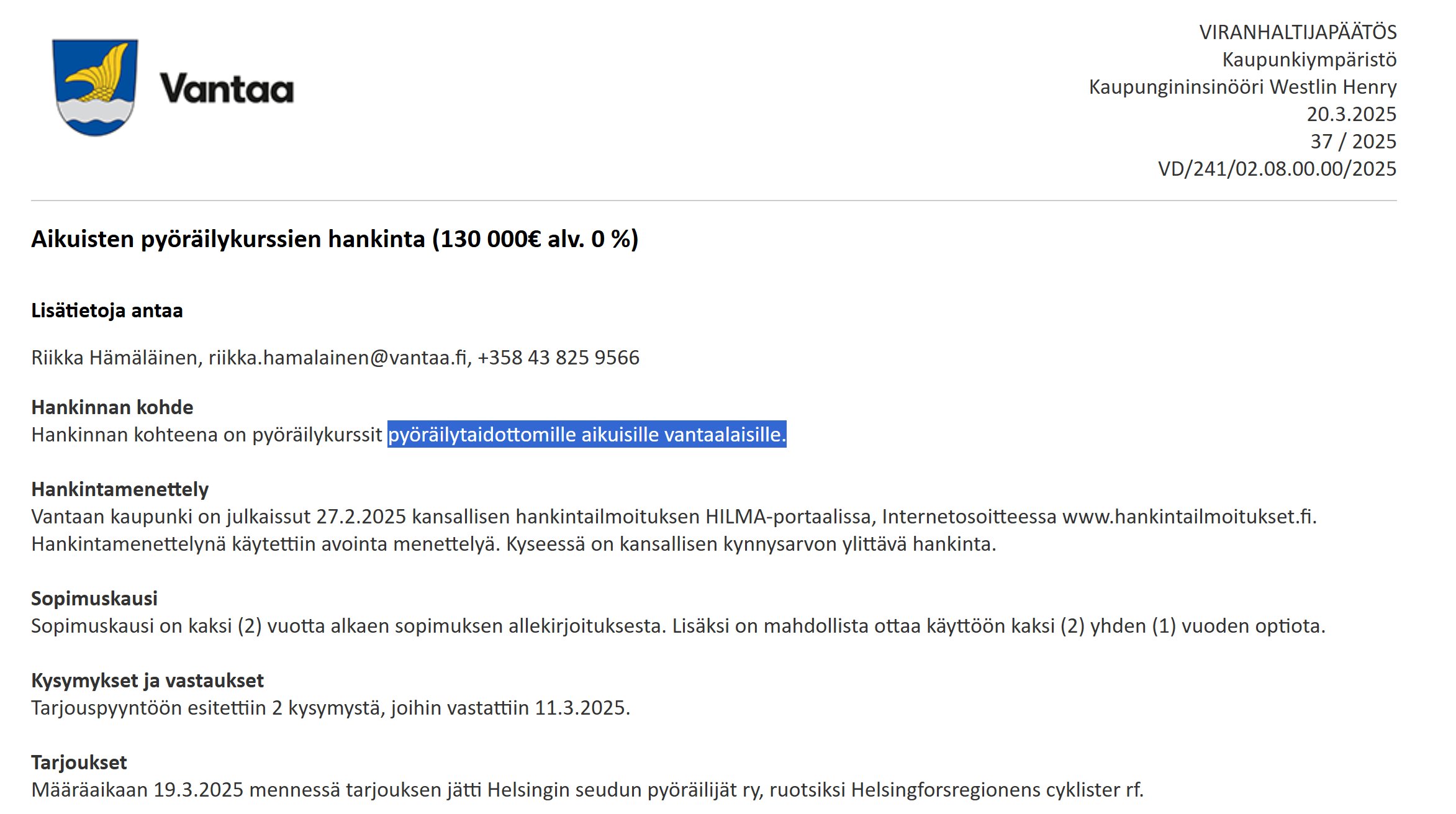 Helsingin seudun pyöräilijät ry (Hepo) on voittanut Vantaan kaupungin julkisen kilpailutuksen aikuisten pyöräilykurssien järjestämisestä. Kursseista osa järjestetään avoimina kursseina kaikille aikuisille vantaalaisille, osa kursseista puolestaan yhteistyössä esimerkiksi järjestöjen, oppilaitosten ja Vantaan kaupungin liikuntapalveluiden kanssa.Hankinta on yhteensä nelivuotinen, johon sisältyy kaksi optiovuotta. Yksi vuosi käsittää 25 kurssia, joiden yhteenlaskettu hinta on 32 050 euroa. Hankinnan laskennallinen kokonaisarvo (mikäli kaikki optiovuodet toteutuvat) on siis n. 130 000 euroa.